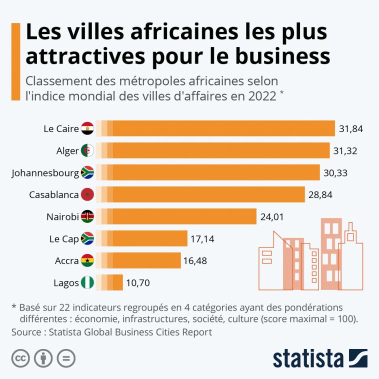 Le portail Statista, spécialisé en recherches statistiques, a publié son rapport “Statista Global Business Cities”, en février 2022, qui identifie et classe les principales villes d’affaires à travers le monde. Sur le continent africain, huit villes ont été répertoriées sur plus de 200 au monde. Le Caire domine la tête du classement en Afrique, sur une liste où se trouvent cinq villes d’Afrique anglophone.